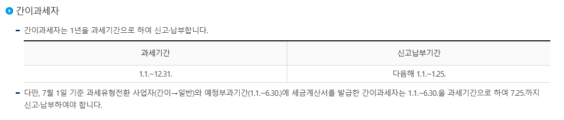 - 일반 → 간이: 7월에 일반과세자로 신고, 다음 해 1월에 간이과세자로 신고