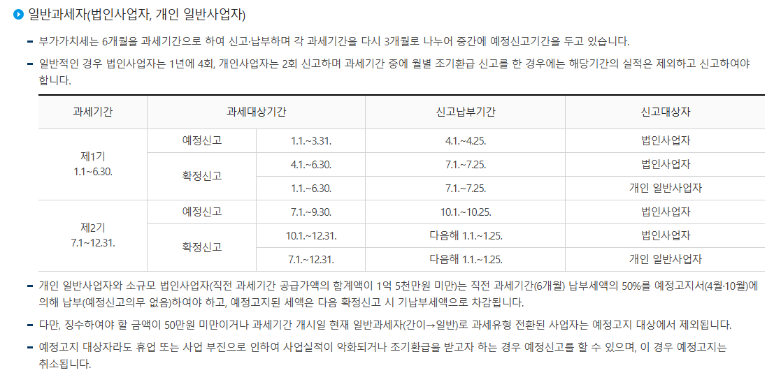 - 제1기: 매년 1월 1일 ~ 6월 30일 (신고: 7월 1일 ~ 7월 25일)