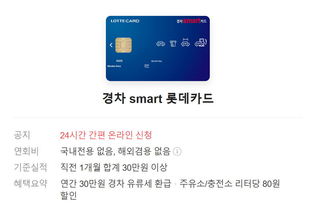 - 추가 혜택: 전국 주유소 리터당 80원 할인, 대중교통 10% 할인, 롯데마트 10% 할인, 엔진오일 교체 시 2만 5천 원 할인