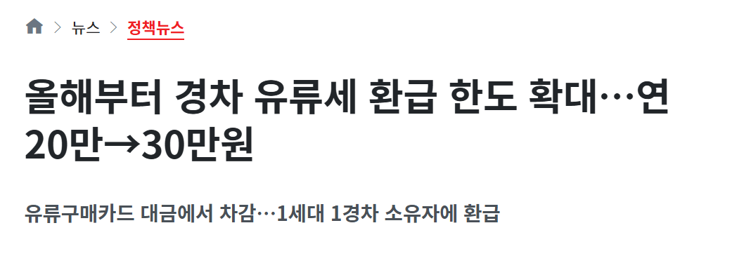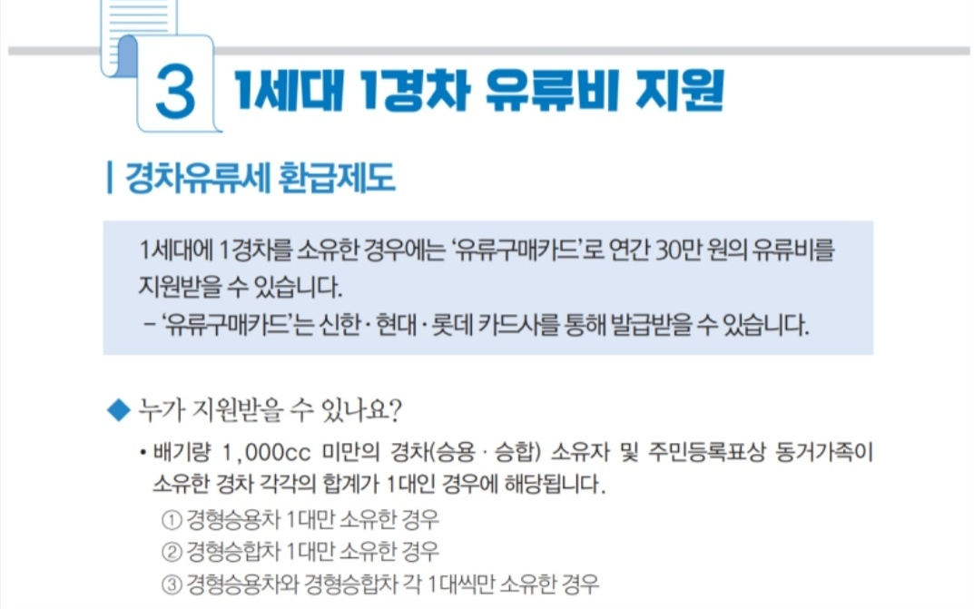 - 유류세 환급 혜택: 휘발유, 경유 리터당 최대 250원, LPG 리터당 160.82원 환급
