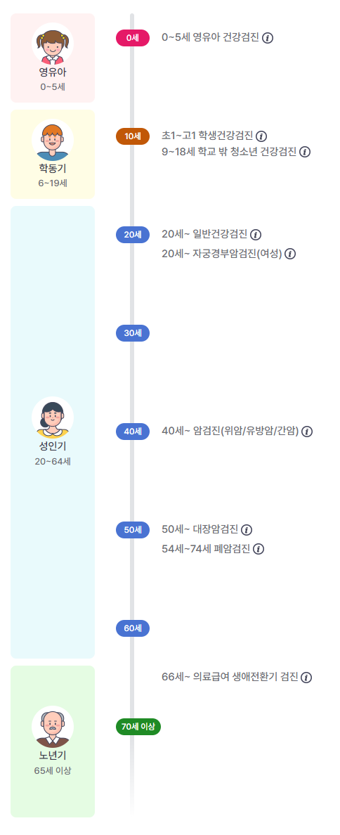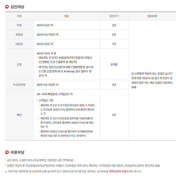 - 유방암: 40세 이상 여성, 2년 주기 (유방촬영)