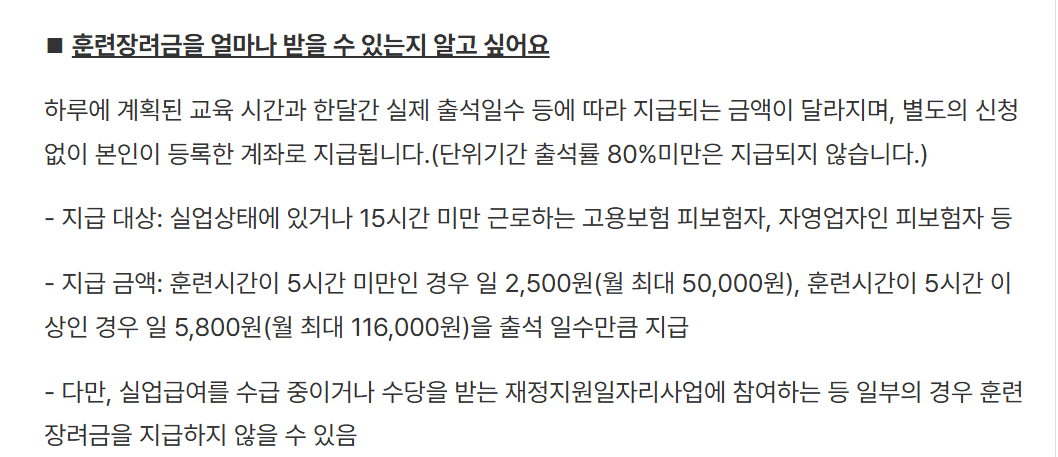 - 140시간 이상의 교육/훈련을 받는 경우, 매월 최대 11만 6천 원(자영업자는 최대 36만 원)의 훈련장려금이 지급됩니다. 단, 출석률이 80% 미만이거나 실업급여를 받고 있다면 지급되지 않습니다.