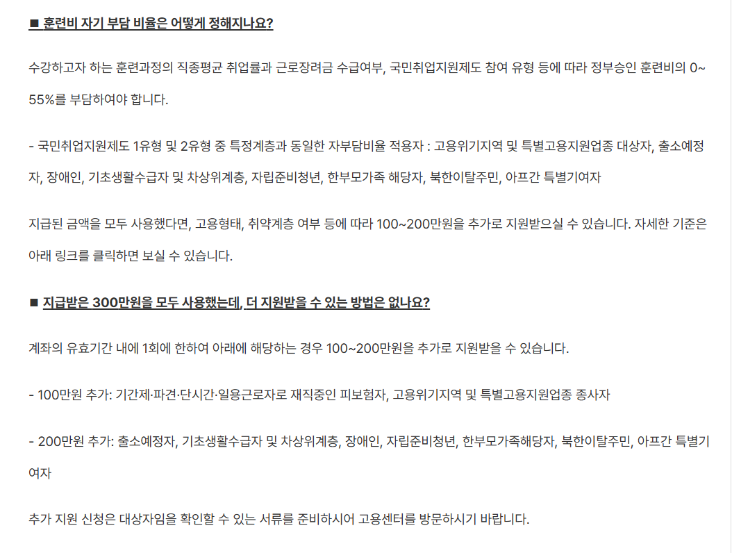 - 또한, 국가 기간산업 및 첨단 산업 관련 훈련의 경우, 300만 원을 초과하는 훈련비를 전액 지원받을 수 있습니다.