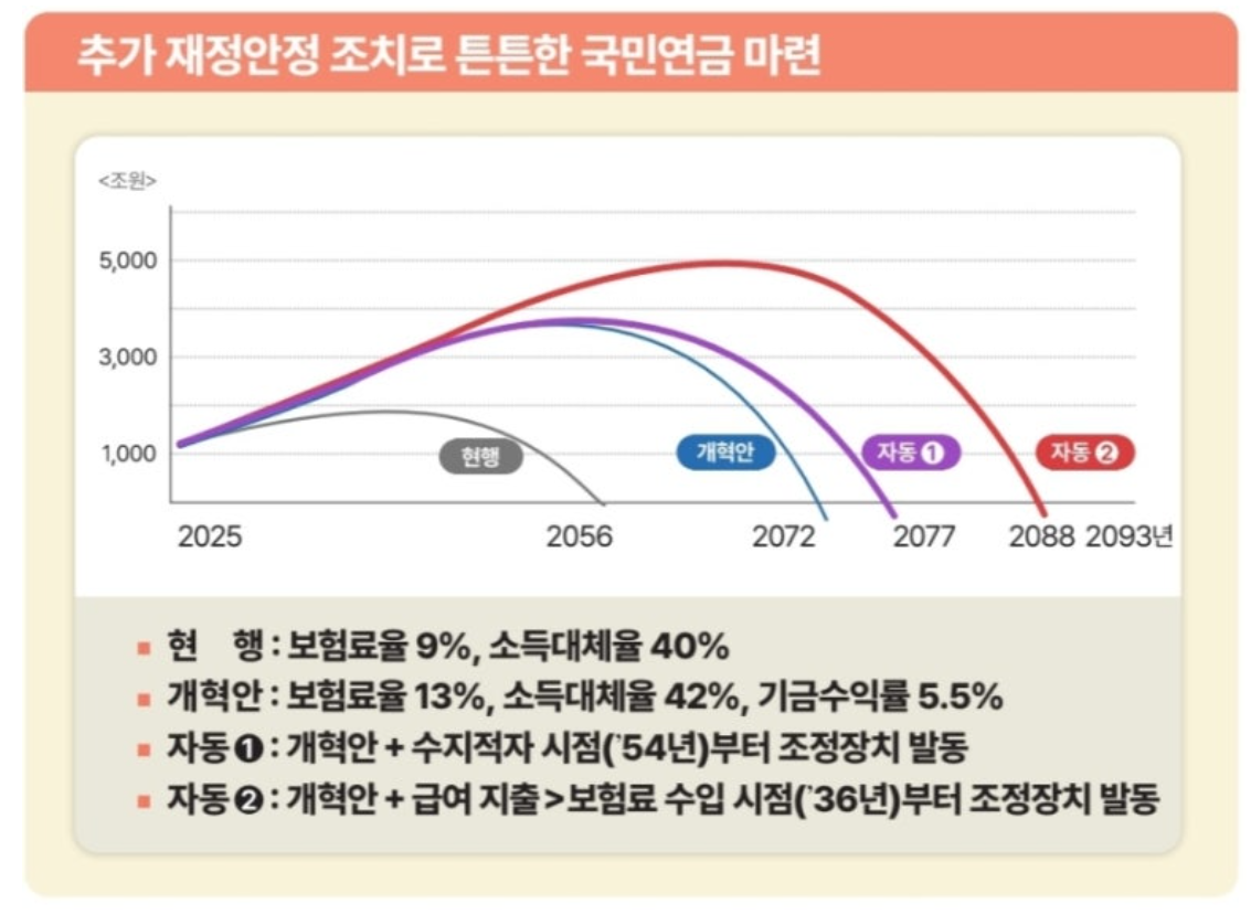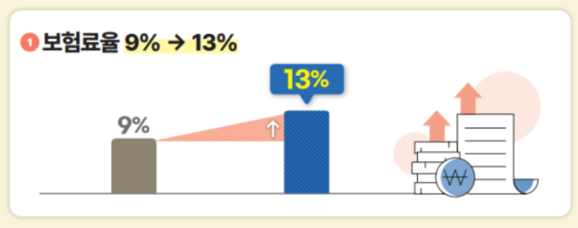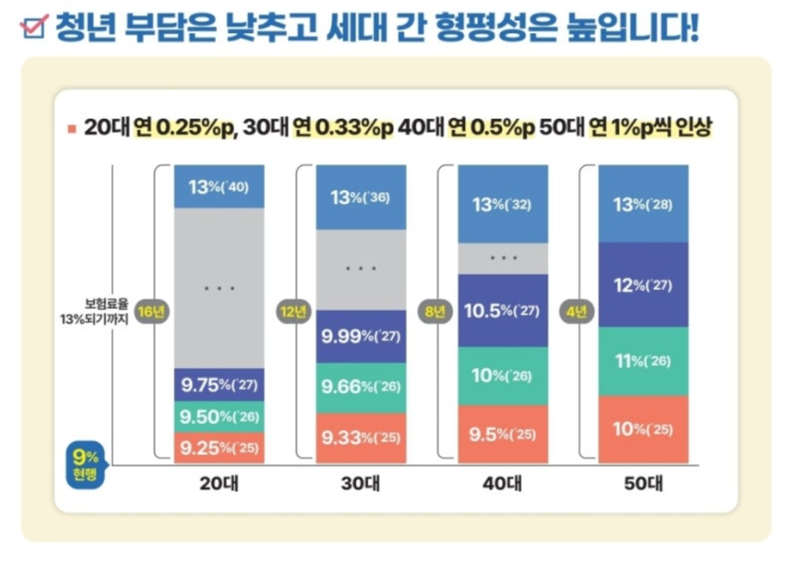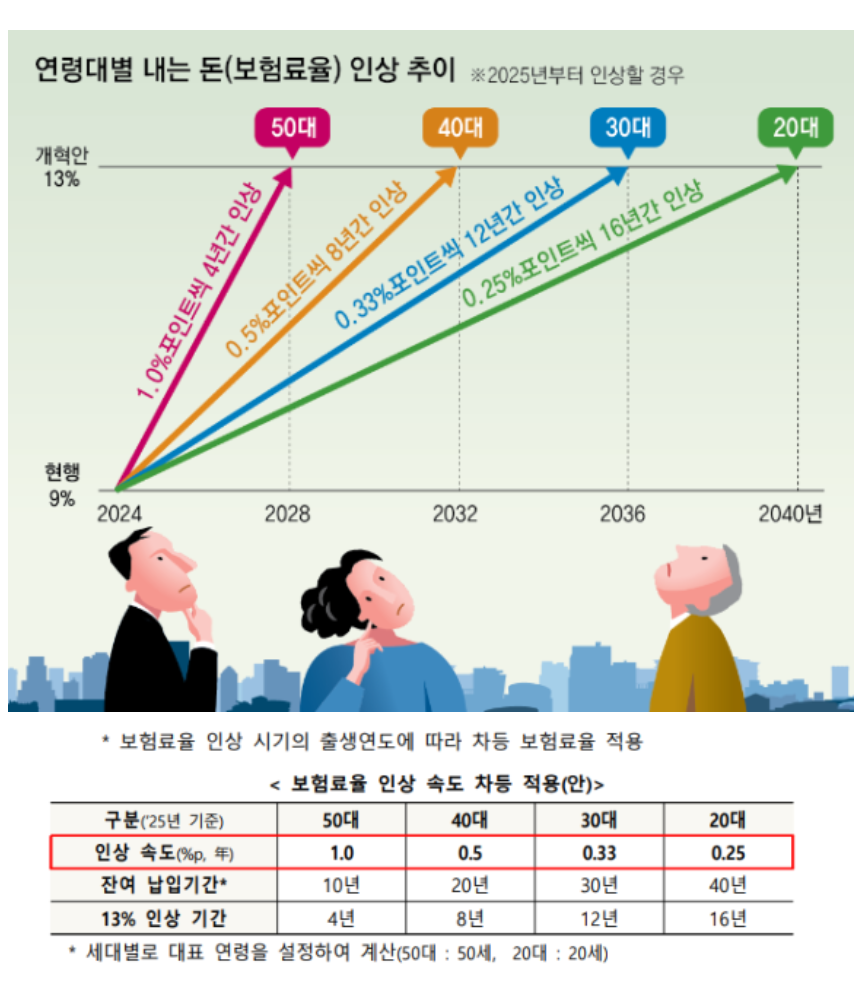 정부가 현행 보험료율을 9%에서 13%로 4% 인상과 소득대체율을 40%에서 42%로 상향 조정 계획을 발표했습니다.