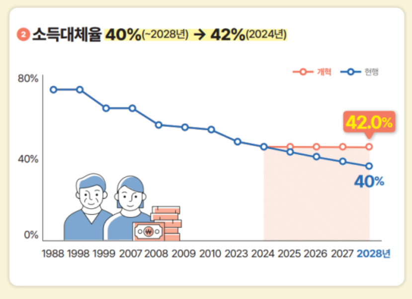 국민연금 소득대체율이란 은퇴 후 받을 수 있는 연금이 은퇴 전 원급의 몇 퍼센트인지 나타내는 비율입니다. 연재는 은퇴 후 연금이 월급의 40%정도이지만 이것을 42%로 올린다는 계획입니다. 국민연금 소득대체율이 높으면 높을수록 더 많은 연금을 받을 수 있기 때문에 노후 생활비를 확보할 수 있게 되는 셈입니다.