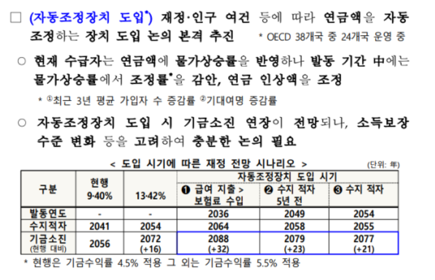 자동조정장치란 국민연금을 더 자동으로 관리하는 시스템이라고 할 수 있습니다. 인구나 경제 상황이 변할 때 연금액도 그에 맞춰 자동으로 조정되는 방식으로 앞으로 연금이 더 안정적으로 관리될 수 있는 방법을 모색하기 위해 자동조정장치를 도입 검토중입니다.