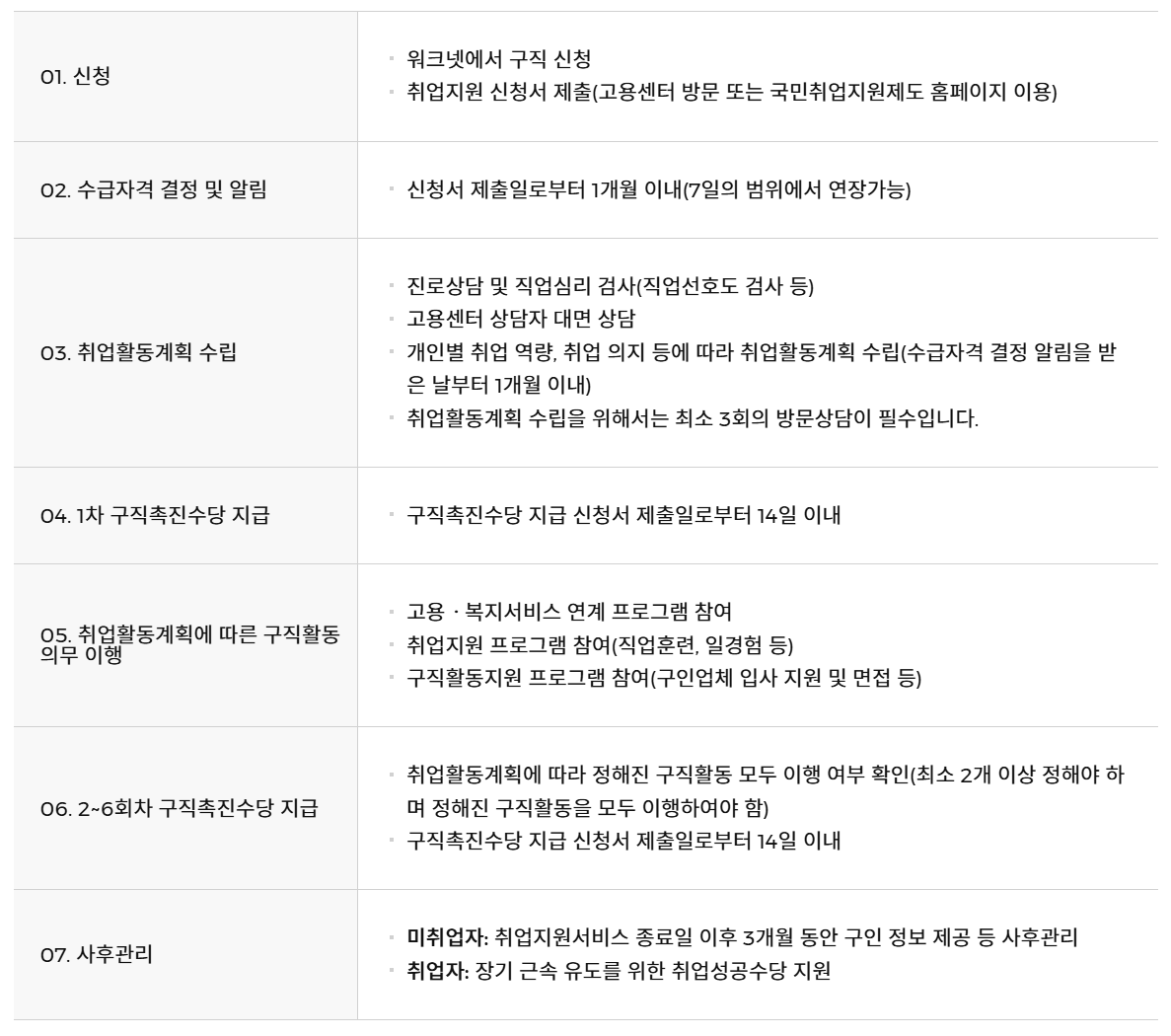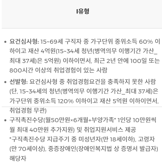 국민취업지원제도는 구직의사가 있지만 취업에 어려움을 겪고 있는 구직자에게 취업지원서비스를 제공하고 저소득 구직자에게는 생계를 위한 최소한의 소득도 결합하여 지원하는 제도입니다. 국민취업지원제도 1유형 참여자에게는 구직촉진수당 매월 50만원씩 6개월간 지급되고 부양가족이 있는 경우 1인당 10만원씩 월 최대 40만원 추가지원합니다.