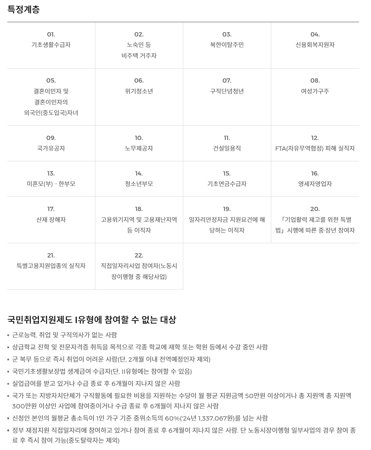 지원대상은 결혼이민자, 위기청소년, 월 소득 250만원 미만인 노무제공자, 영세 자영업자등의 특정계층과 15세 이상 34세 이하의 구직자, 35세 이상 69세 이하 구직자 중 중위소득 100% 이하인 사람입니다.