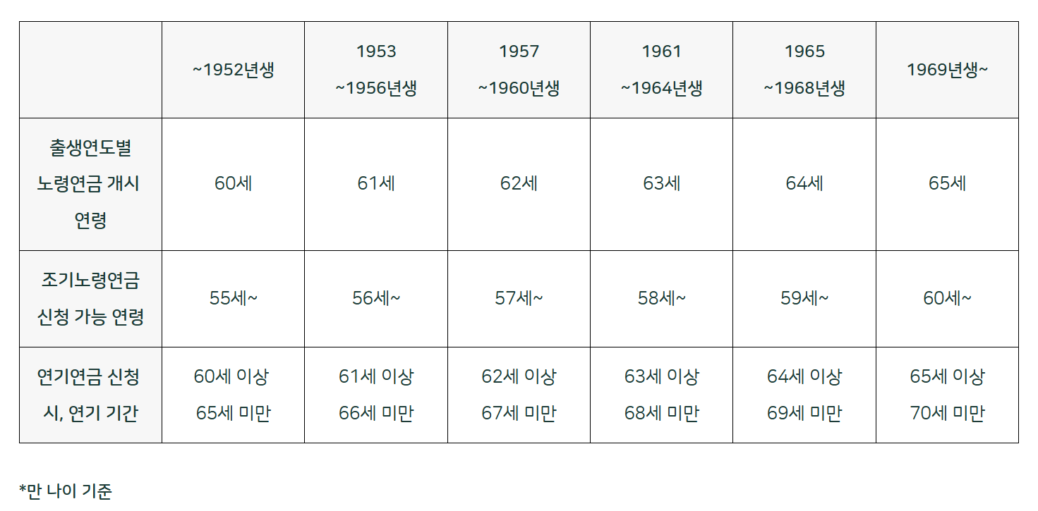 - 지급개시연령은 1953년생부터 점차 상향되어 1969년 이후 출생자부터는 65세에 연금을 받을 수 있습니다.
