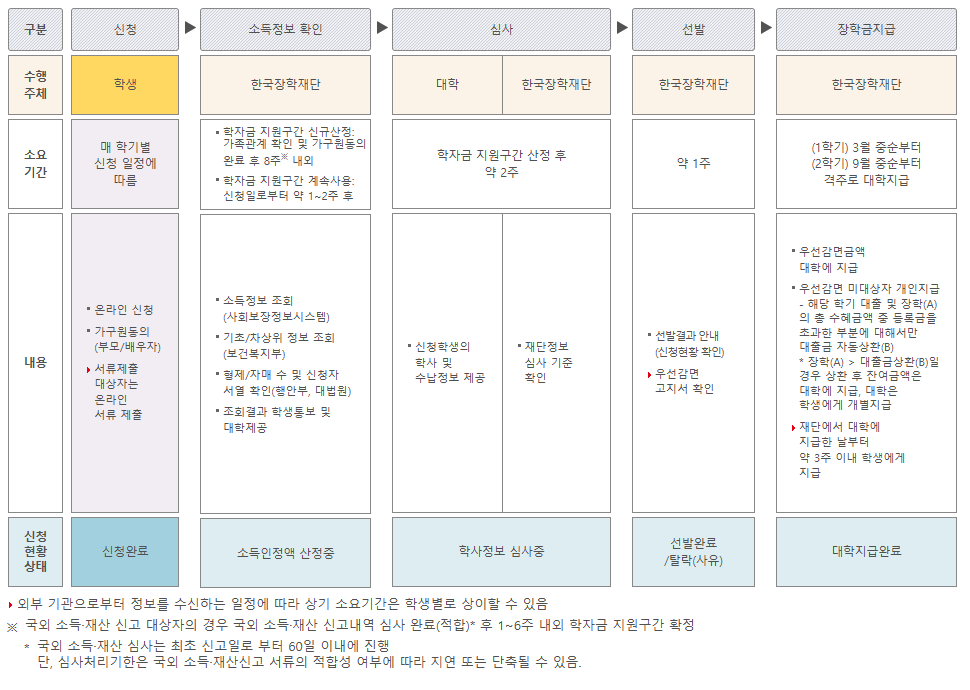 국가장학금은 한국장학재단 홈페이지에서 신청할 수 있으며, 소득 구간 심사에 약 8주 정도 소요됩니다. 따라서 빠르게 신청할수록 결과도 빨리 받을 수 있습니다.