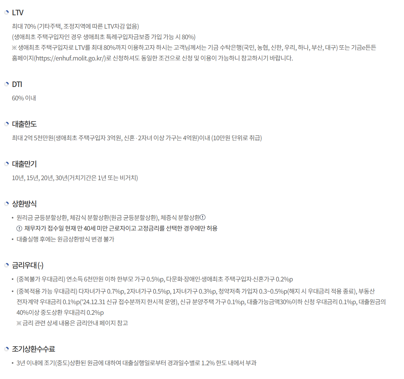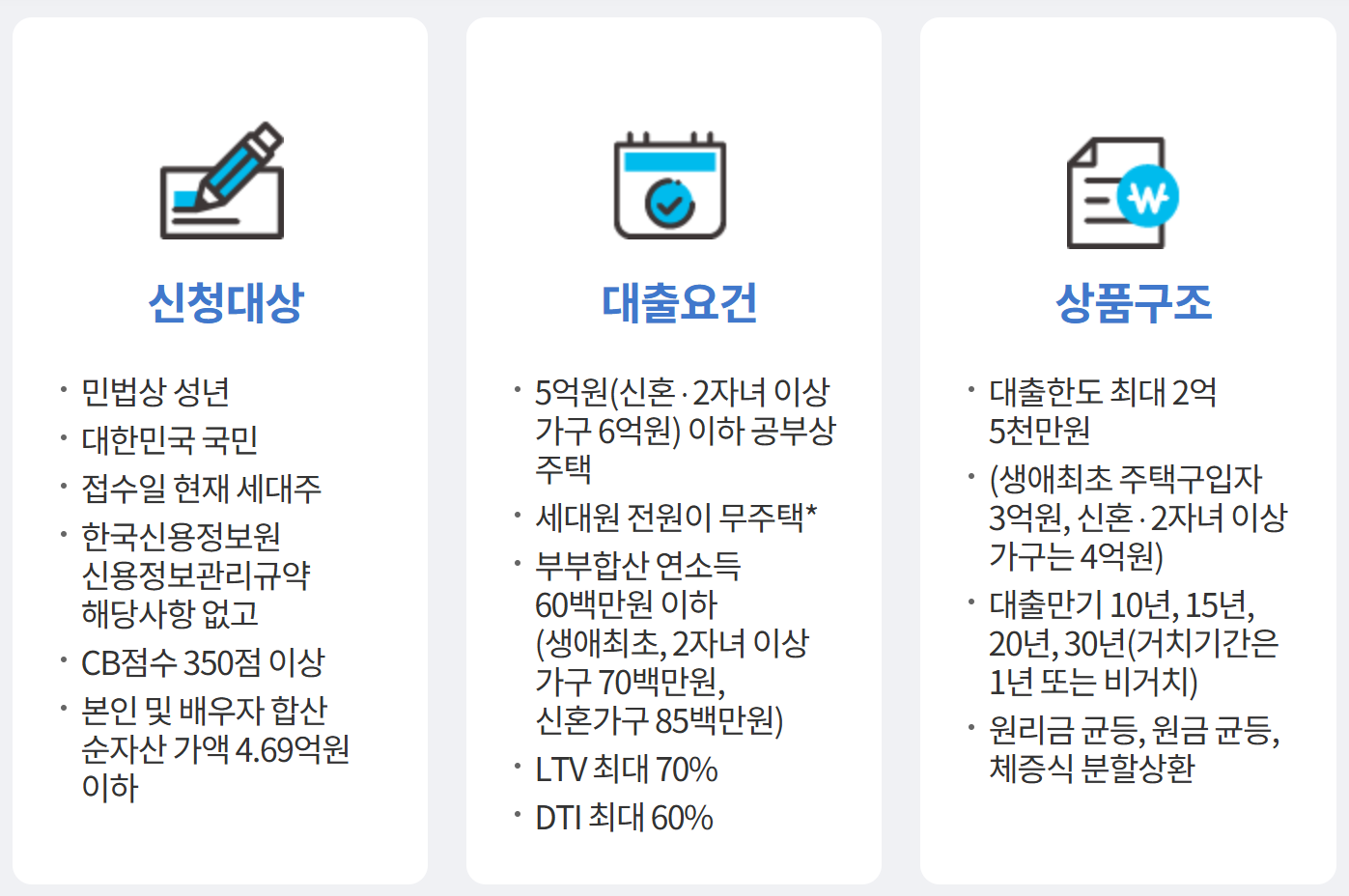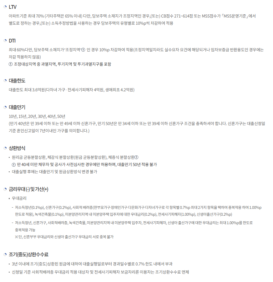 - 대출 한도: 최대 2.5억 원(신혼부부나 생애 최초 주택 구매자는 최대 4억 원)