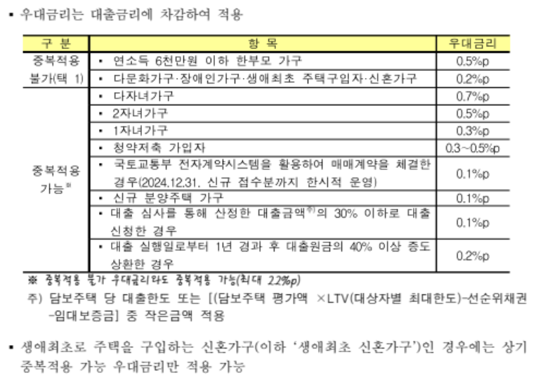 - 특별 혜택: 신생아 특례대출(LTV 70%, 생애 최초 구매 시 80% 가능), 다자녀 가구와 신혼부부에게 추가적인 우대 금리 제공