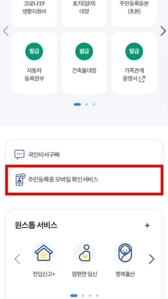 로그인 후 메인 화면에서 아래로 스크롤하여 '주민등록증 모바일 확인 서비스' 메뉴를 찾아 클릭합니다.