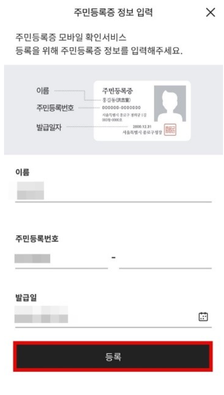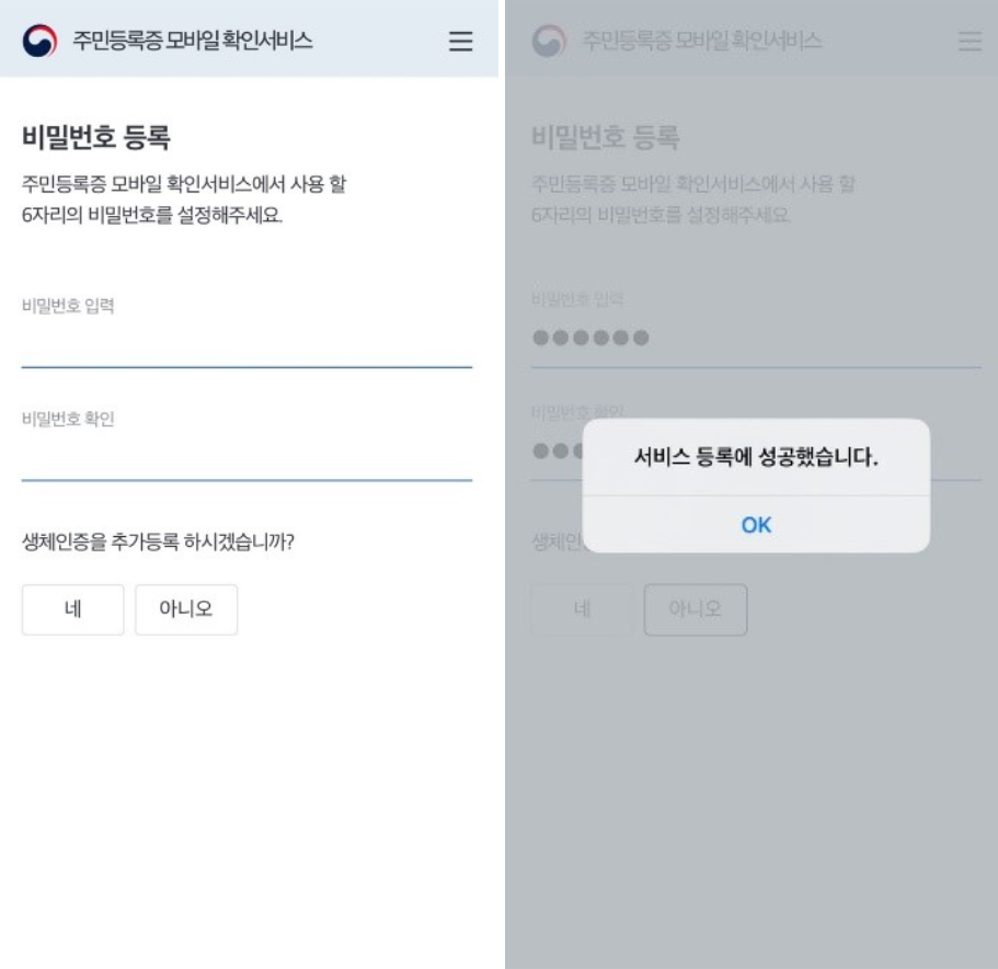 정보 입력 후 6자리 비밀번호를 설정하고, 필요시 생체 인증(지문 또는 얼굴 인식)을 추가로 등록하세요. 이후 모바일 신분증 발급이 완료됩니다.