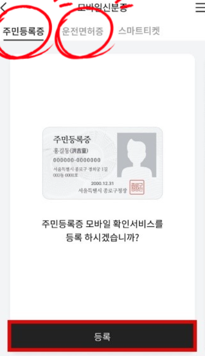 다음 화면에서 주민등록증이나 운전면허증 중 원하는 신분증을 선택합니다.