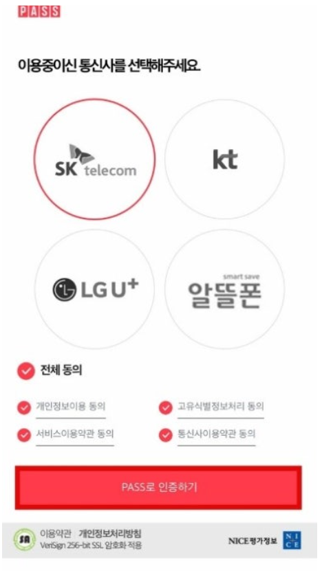 PASS 앱을 통해 본인 확인을 위해 전화번호 인증을 완료해야 합니다. 통신사 정보와 전화번호를 입력하고 PASS 인증을 마치면, 주민등록증 정보를 입력하는 화면이 나옵니다.