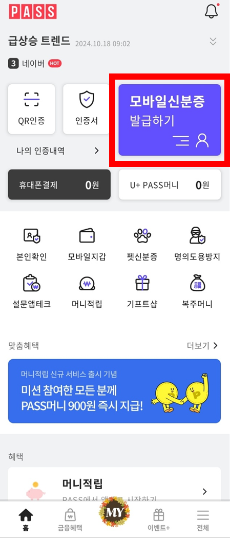 스마트폰에 PASS 앱을 설치하고 로그인합니다. 메인 화면에서 모바일 신분증 메뉴를 클릭하세요.