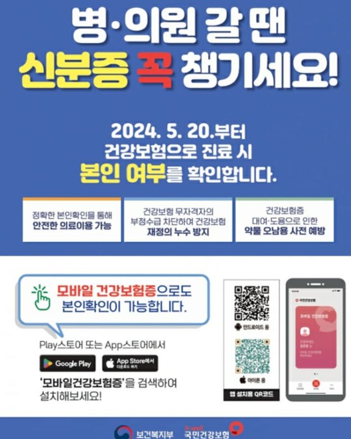 2024년 5월 20일 보건복지부에서 전국 병원에서 진료 접수 시 신분증 본인확인을 의무화하여 요양기관 본인 확인 강화 제도를 시행하였습니다. 기존에는 건강보험으로 진료를 보려는 환자는 주민