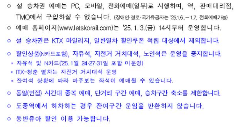 - 조기 예매: 명절 기간 좌석은 빠르게 매진되니 서둘러 예매를 완료하세요.