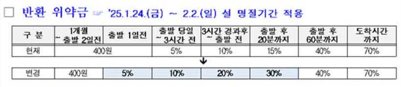 이번 설 명절 특별 조치는 더 많은 사람들이 공정하게 열차를 이용할 수 있도록 돕기 위한 방안입니다. 승차권 예매 전, 환불 위약금 정책을 꼼꼼히 확인하여 불필요한 손해를 피하시기 바랍니다. 올 설 명절, 코레일과 함께 안전하고 편안한 고향 방문이 되시길 바랍니다.