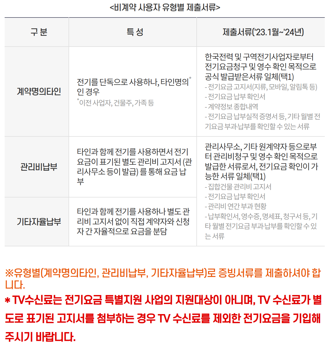 - 비계약사용자 - 전기를 단독으로 사용하지만 계약자 명의가 타인인 경우 / 타인과 함께 전기를 사용하며, 별도의 전기요금이 표기된 관리비고지서(관리사무소 등이 발급) 등을 통해 요금을 납부하는 경우 / 그 외 타인과 함께 전기를 사용하나 별도의 전기요금이 표기된 관리비고지서 없이 직접 계약자와 신청자가 자체적으로 요금을 분담하는 경우
