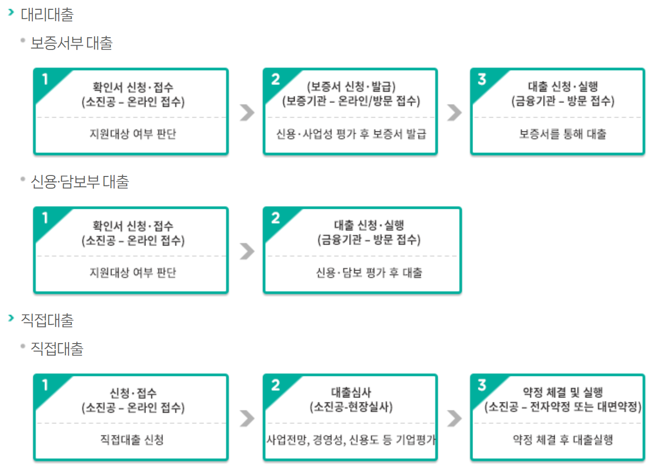 - 대리대출 : 지원한 대상에게 소상공인진흥공단에서는 보증서만 발급하고 발급받은 보증서를 취급 은행에 제출하여 은행에서 자금을 지급