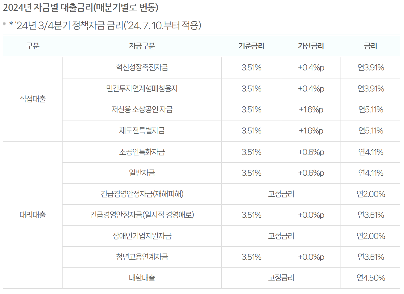 - 2024년 7월 10일부터 적용된 3/4분기에 적용되는 소상공인 정책자금 금리는 다음과 같습니다.