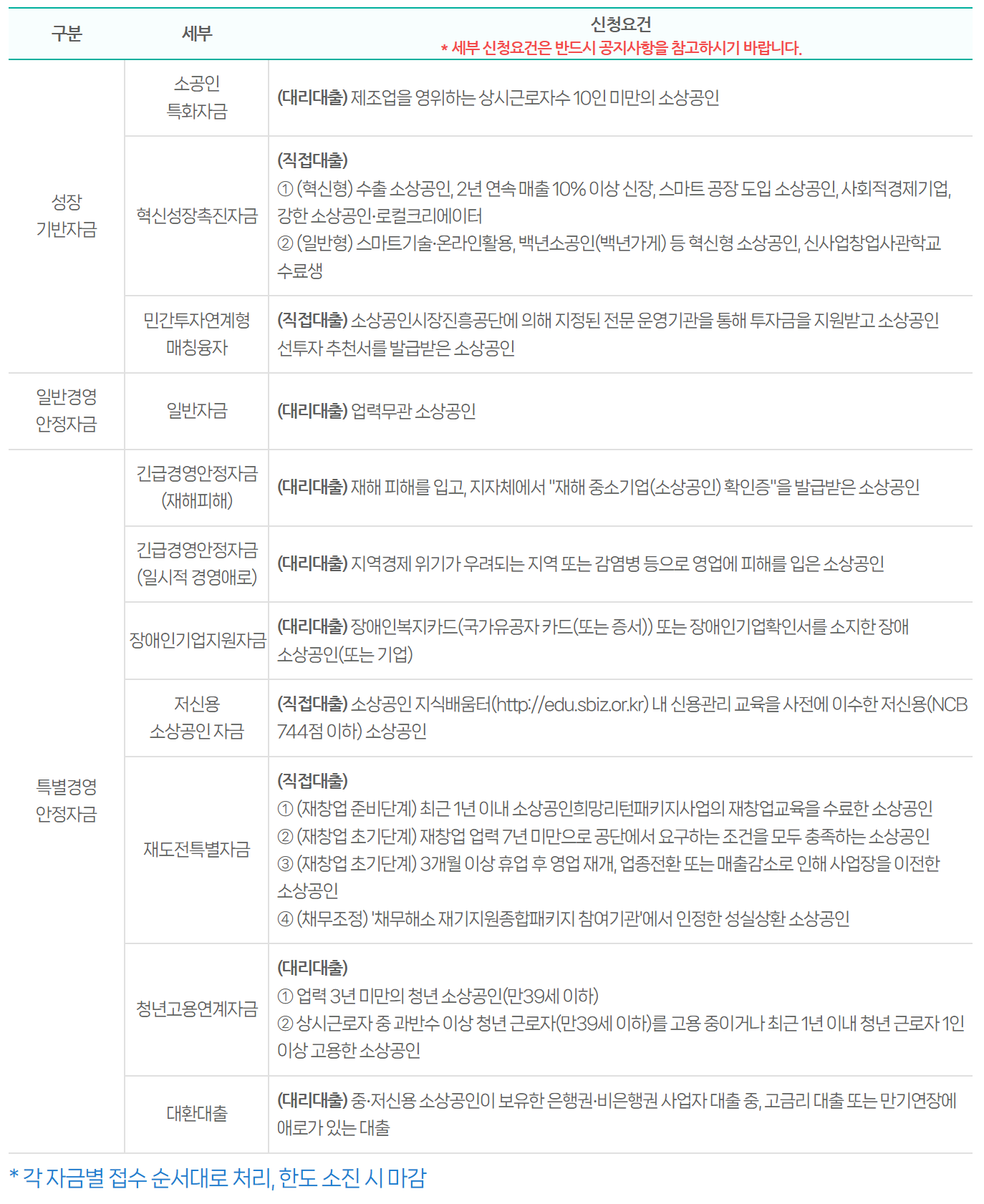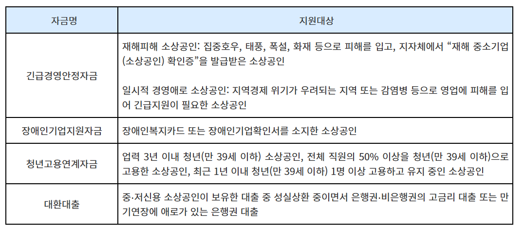 - 소상공인 정책자금 특별경영 안정자금 : 경기침체지역, 재해지역, 저신용자, 재창업 또는 채무 조정자, 장애인, 재창업자 등의 취약계층 대상으로 고정금리 자금을 지원