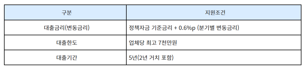 - 소상공인 정책자금 일반경영 안정자금의 융자 한도는 업체당 최대 7천만원으로 이자율은 소상공인 정책자금 기준금리에 연동되어 변동됩니다.