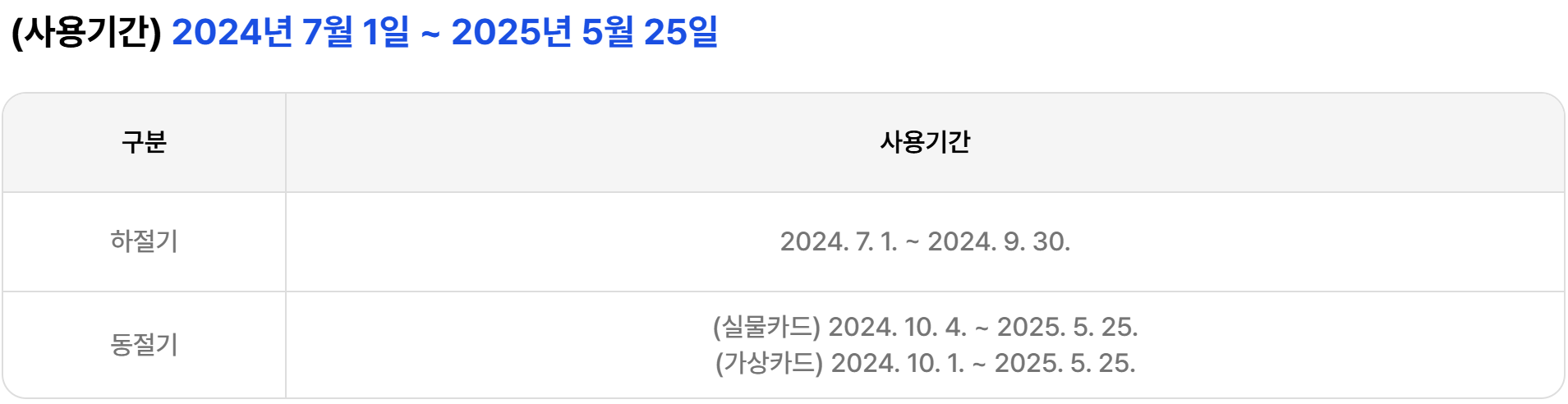 가상카드는 하절기인 7월 1일부터 9월 말일까지, 동절기인 10월 1일 부터 다음 해 5월 25일까지 발행되는 발행 고지서에서 요금이 차감됩니다.