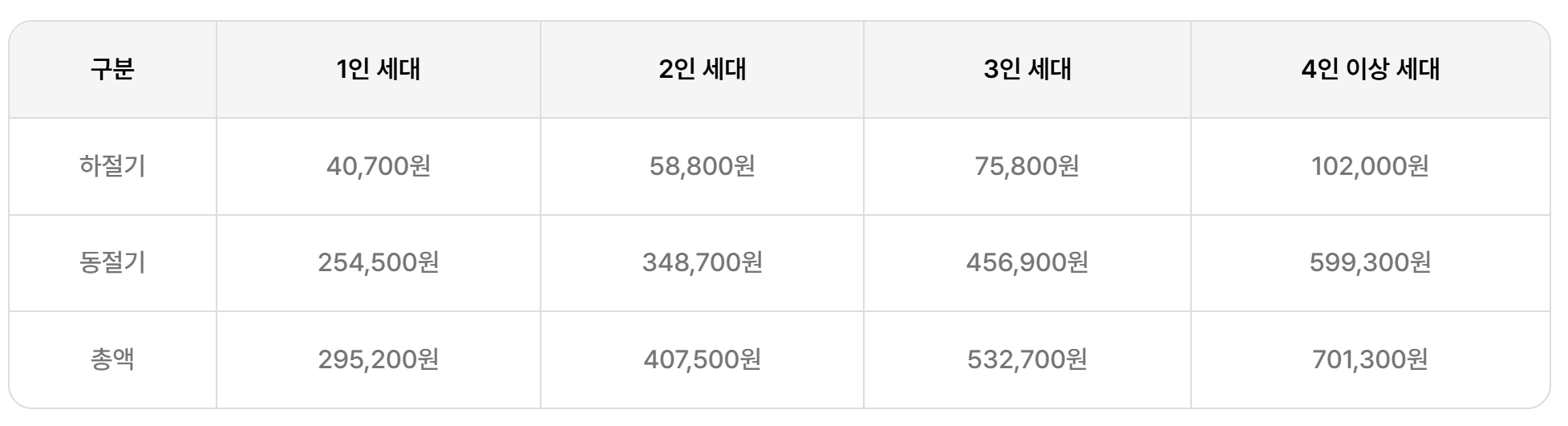 - 요금차감방식 : 하절기 2024. 7. 1. ~ 2024. 9. 30 전기요금 지원 / 동절기 2024.10.1 ~ 2025. 5. 25. 전기, 도시가스, 지역난방 중 하나를 선택하여 지원