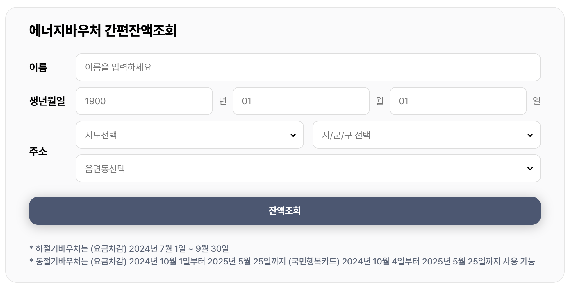 에너지바우처 잔액조회는 에너지바우처 사용기간 내에만 가능합니다.