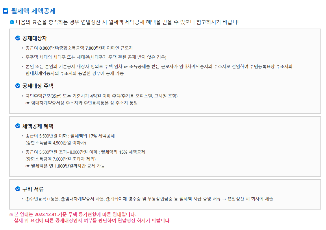 - 총급여액 5,500만 원 초과 ~ 8,000만 원 이하: 월세액의 15% 공제.