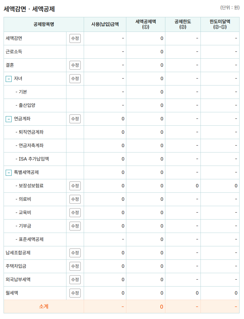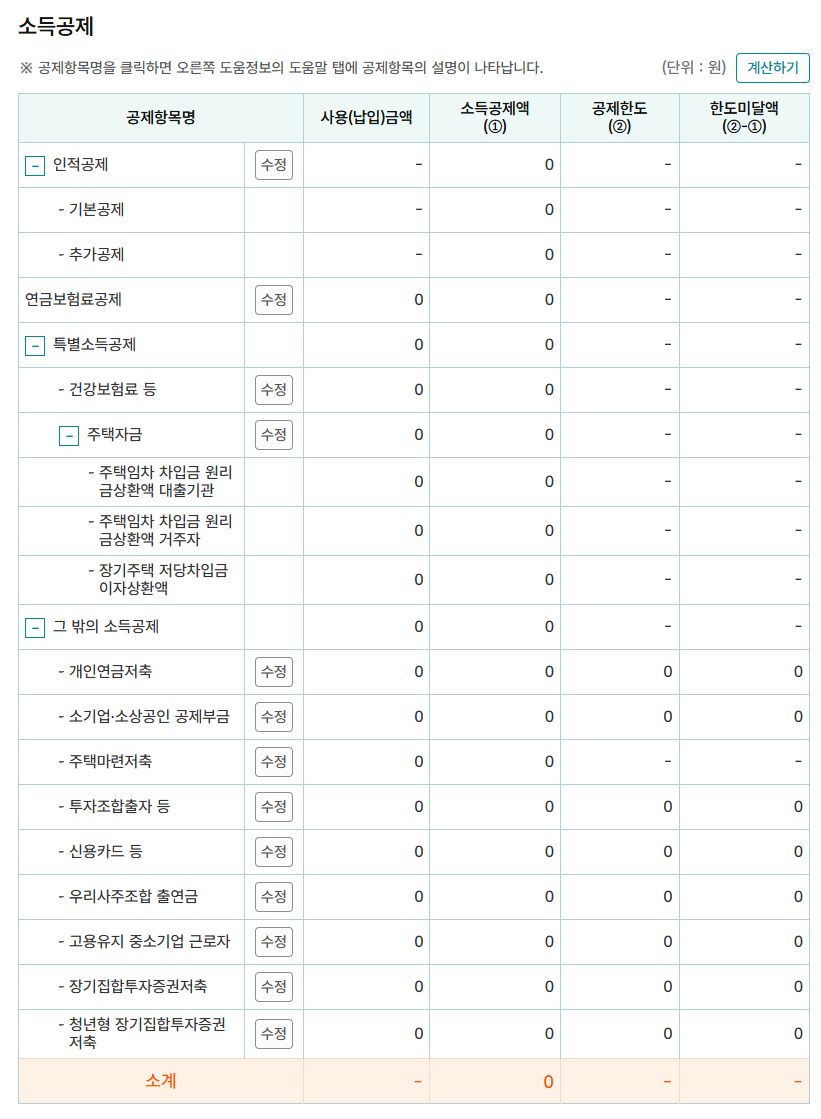 - 건강보험료, 주택자금, 신용카드 사용금액 등을 입력합니다.