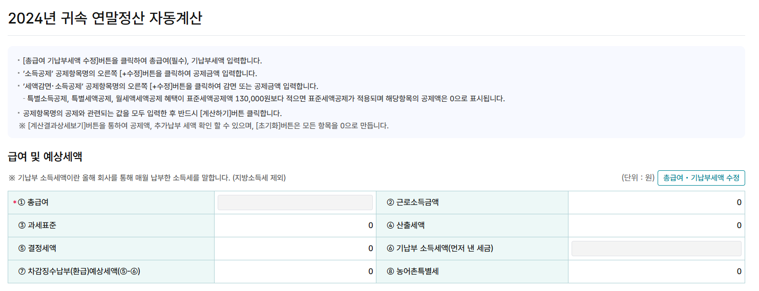 - 자동계산 페이지에서 본인의 총급여와 기납부세액을 입력합니다.