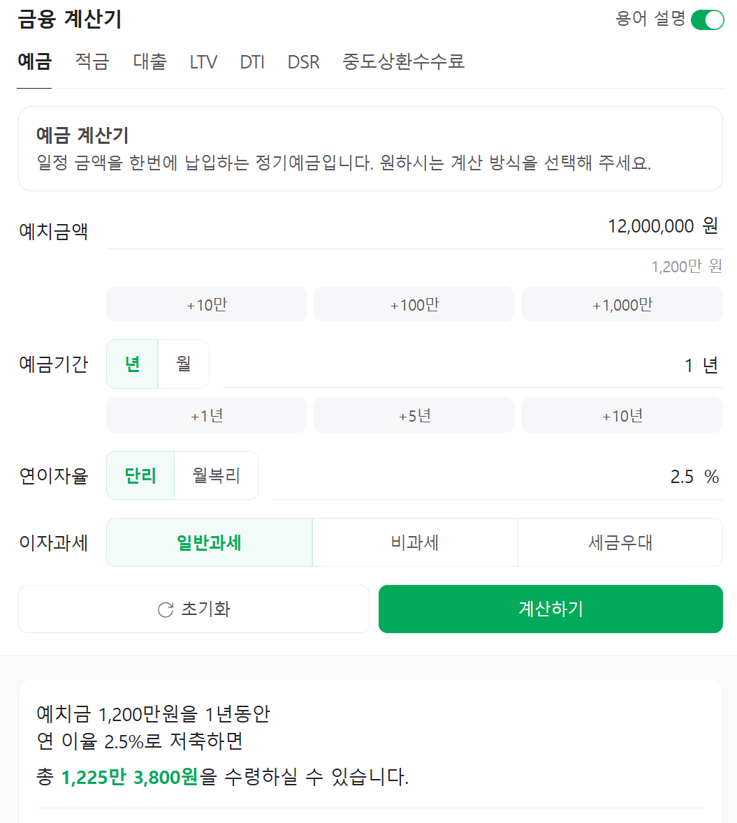 예금은 목돈이 필요하고, 이자를 매월 받으며 단리 방식으로 계산되는 경우가 많아 계산 방식도 간단합니다. 예를 들어 1,200만 원을 연 2.5%로 예치하면, 세후 수령액은 약 1,225만 원 정도입니다.