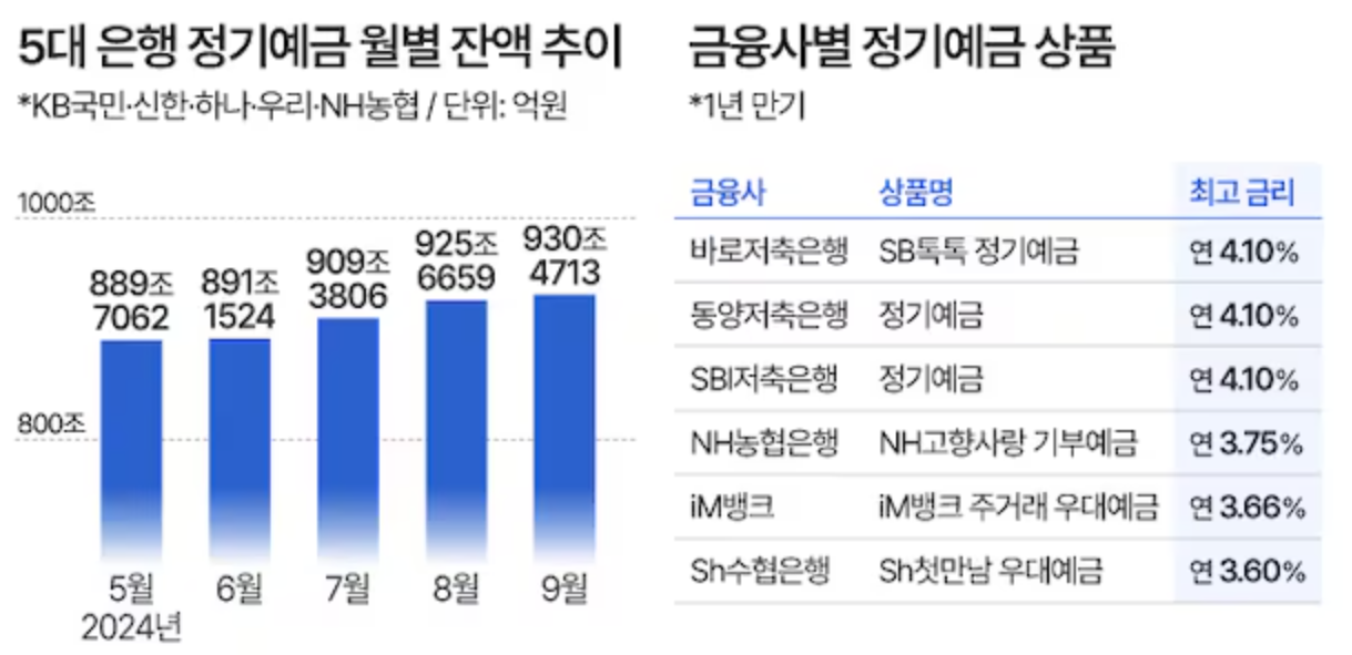 지난 9월 말 기준 KB국민은행, 신한은행, 하나은행, 우리은행, NH농협은행 등 5대 은행의 정기예금 잔액은 930조 원을 넘어서며 전월 대비 약 5조 원이 증가했습니다. 올해 들어서만 무려 81조 원이 넘는 금액이 예금에 몰렸습니다. 이러한 증가의 원인은 금리 인하가 예상되기 때문입니다. 금리가 더 내려가기 전에 조금이라도 높은 금리의 예금 상품에 가입하려는 수요가 급증한 것입니다.