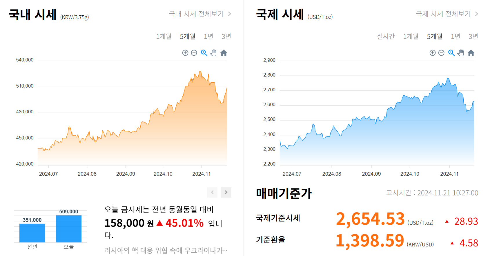 국제 금값은 현재 1온스당 2,652달러로, 전날 대비 0.831% 상승했습니다. 이는 안전 자산에 대한 수요 증가와 러시아-우크라이나 갈등의 영향 때문으로 분석됩니다. 국내 원달러 환율은 1,398.90원으로, 환율 변동도 국내 금시세에 직접적인 영향을 미칩니다.