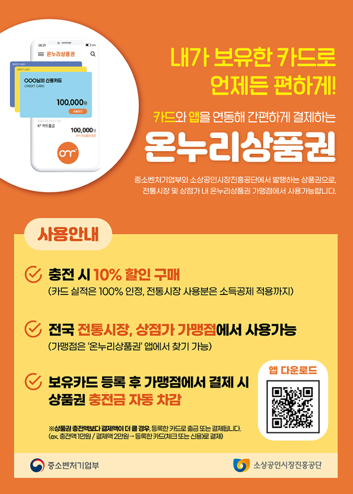 온누리상품권이란 소상공인시장 진흥공단과 중소벤처기업부에서 발행하는 전통시장 및 상점가에서 사용할 수 있는 상품권입니다. 온누리상품권은 온라인가맹점에서도 사용가능하며 10% 할인이 적용되고 월 구매한도 최대 200만원까지 사용 가능합니다.