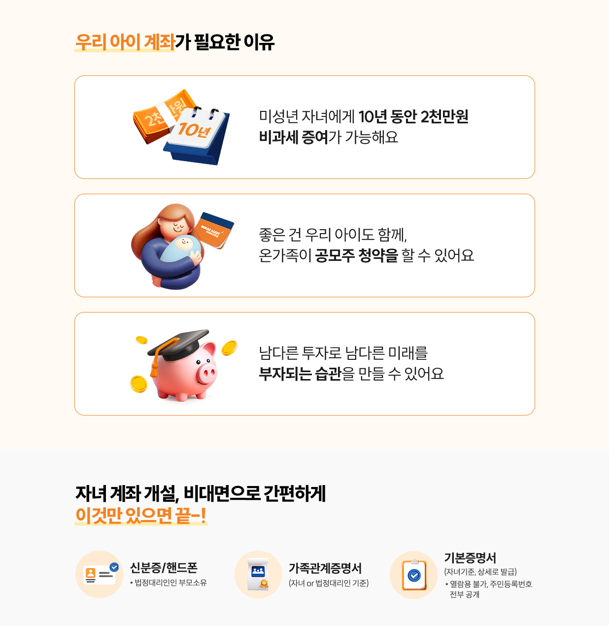 - 미래 준비: 자녀의 이름으로 시작한 투자 금액은 시간이 지나면서 자산이 되어 돌아옵니다.