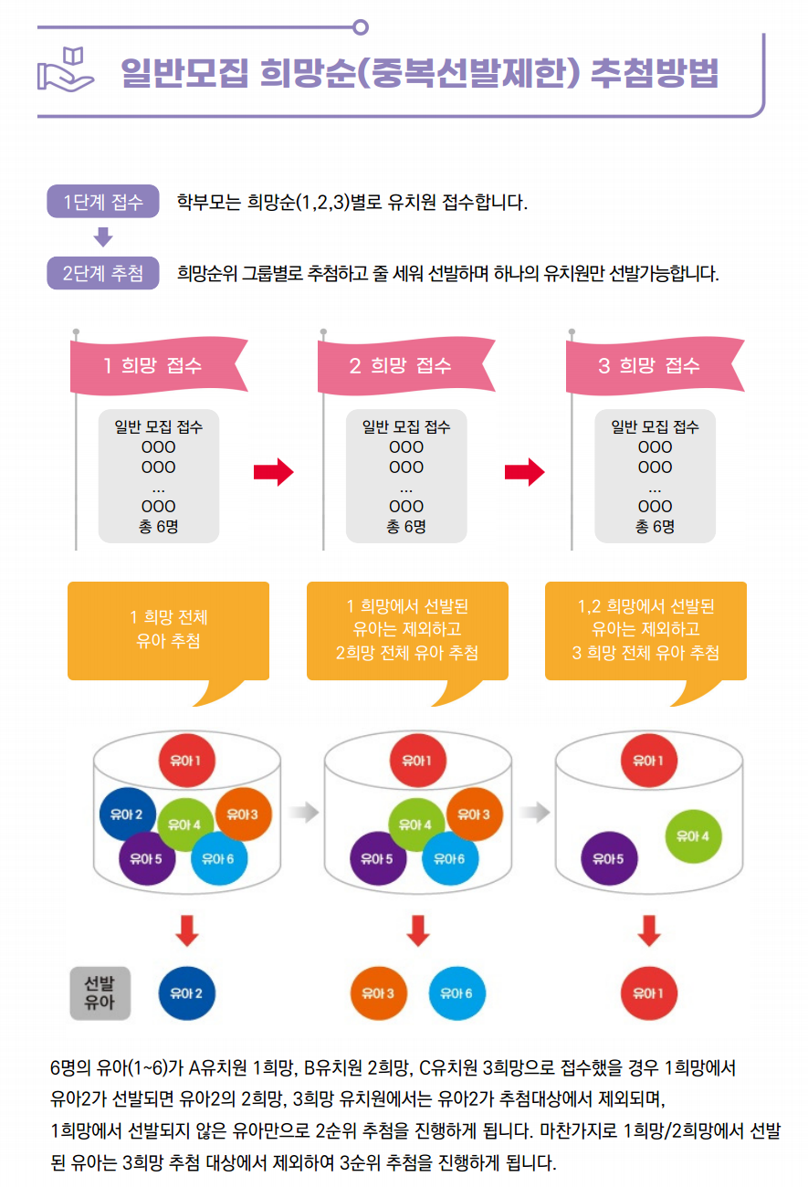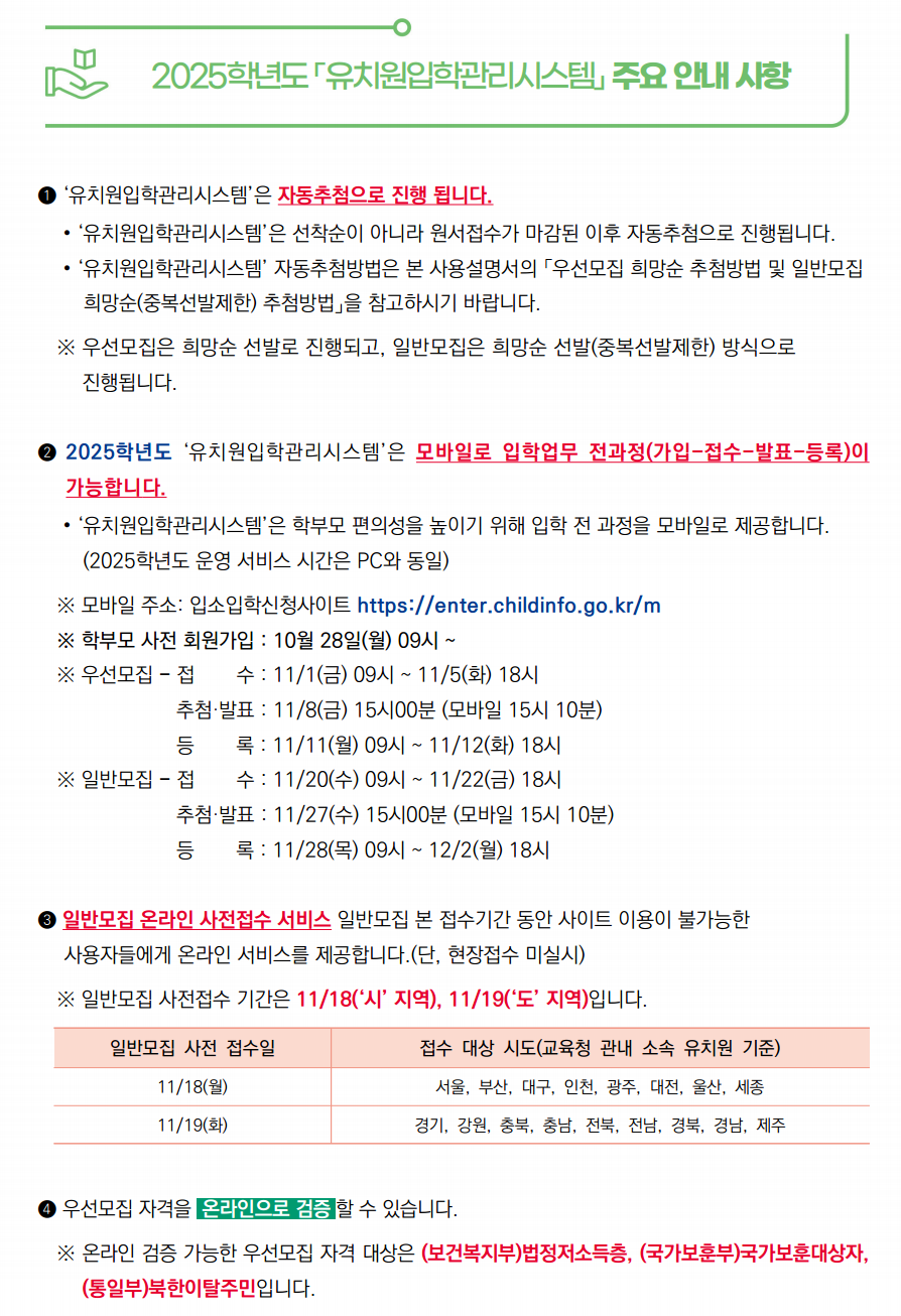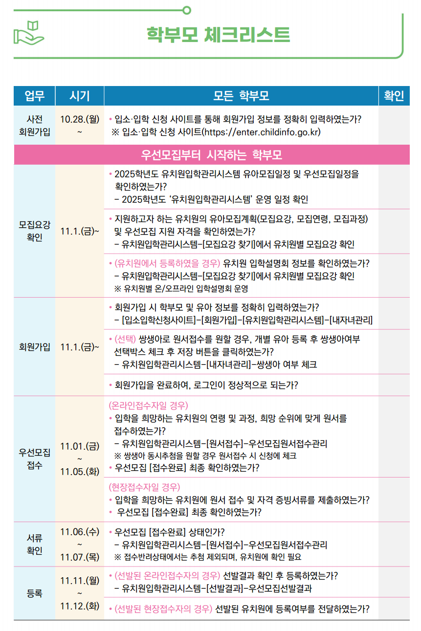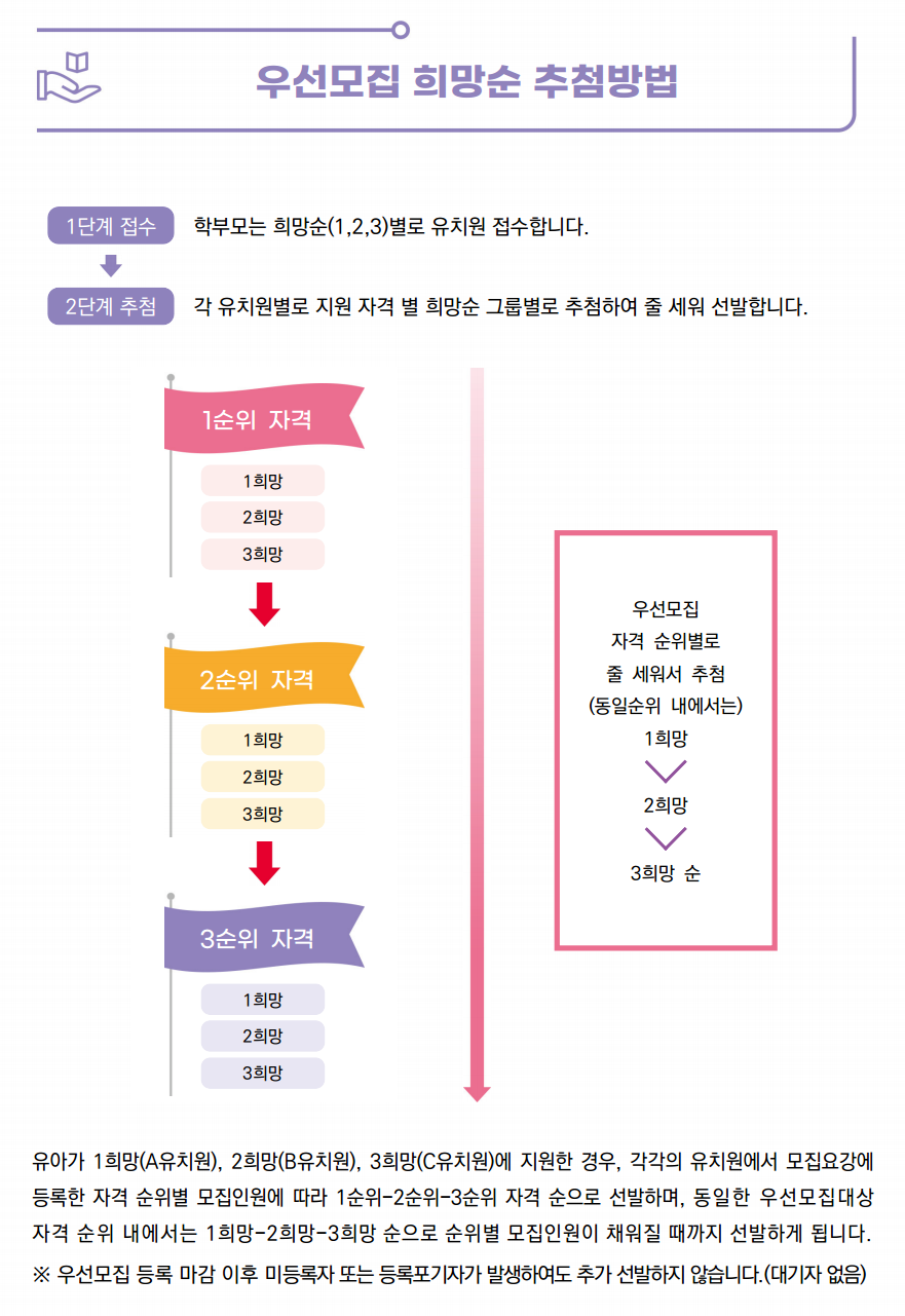 - 우선모집: 사회적 배려가 필요한 아동을 위한 모집으로, 법정 저소득층, 국가보훈대상자, 쌍생아 등이 우선순위로 배정됩니다. 우선모집은 일반모집보다 1~2주 빠르게 진행되며, 올해 우선모집 접수는 11월 1일부터 5일까지였습니다.