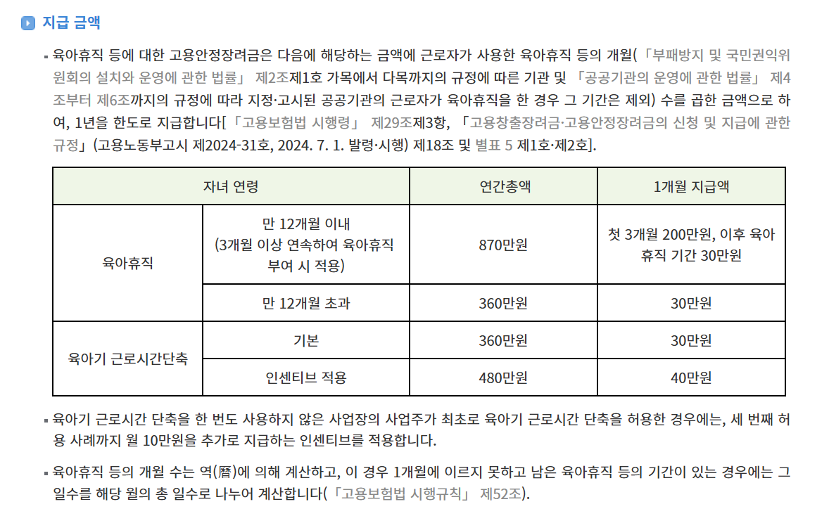 - 육아기 근로시간 단축 기간: 1개월 지급액은 80만 원.