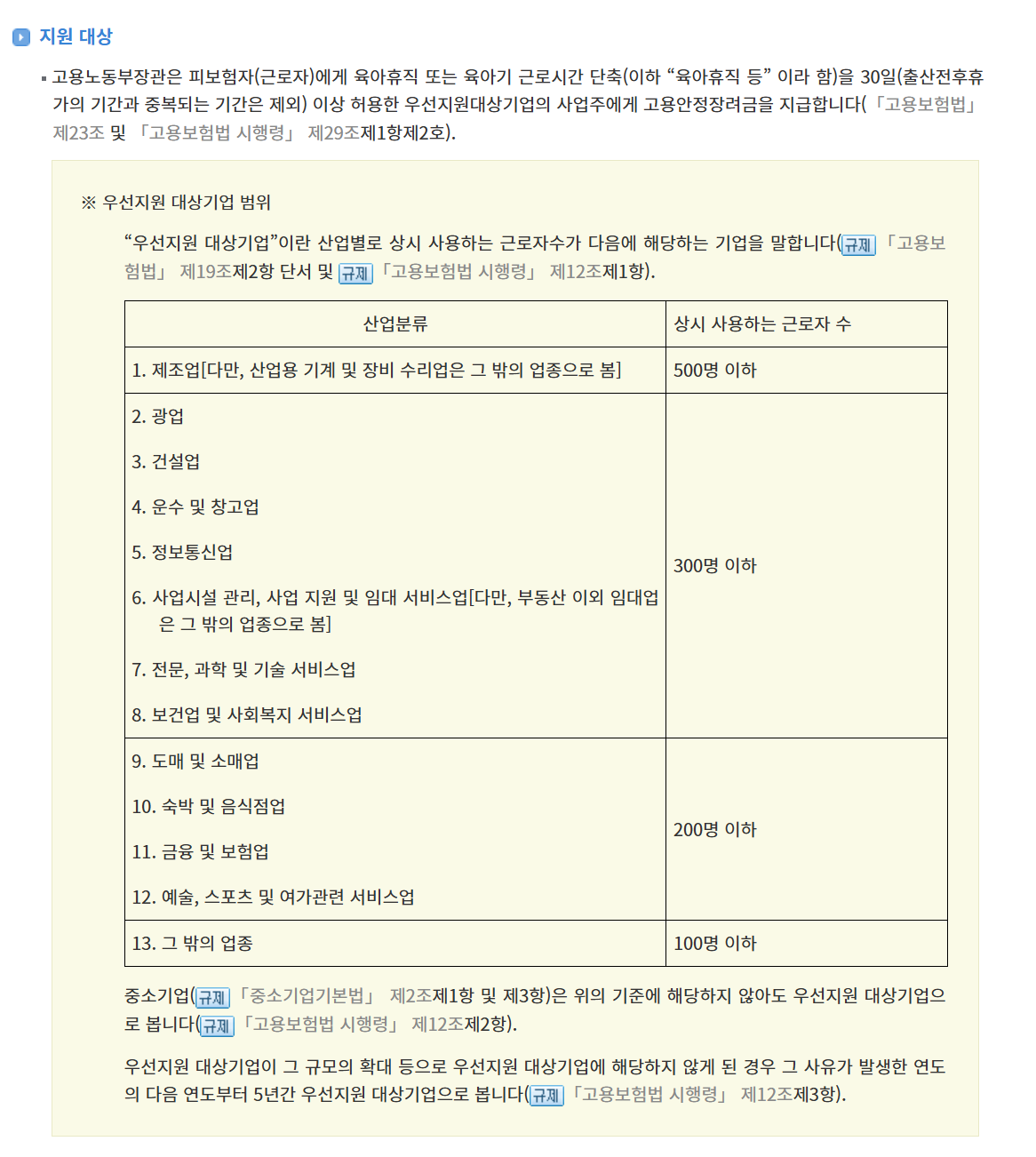 고용안정장려금은 출산 전후 휴가나 육아기 근로시간 단축을 30일 이상 부여하고, 대체인력을 고용한 우선지원대상기업 사업주에게 지급됩니다. 다음 요건을 충족해야 합니다: