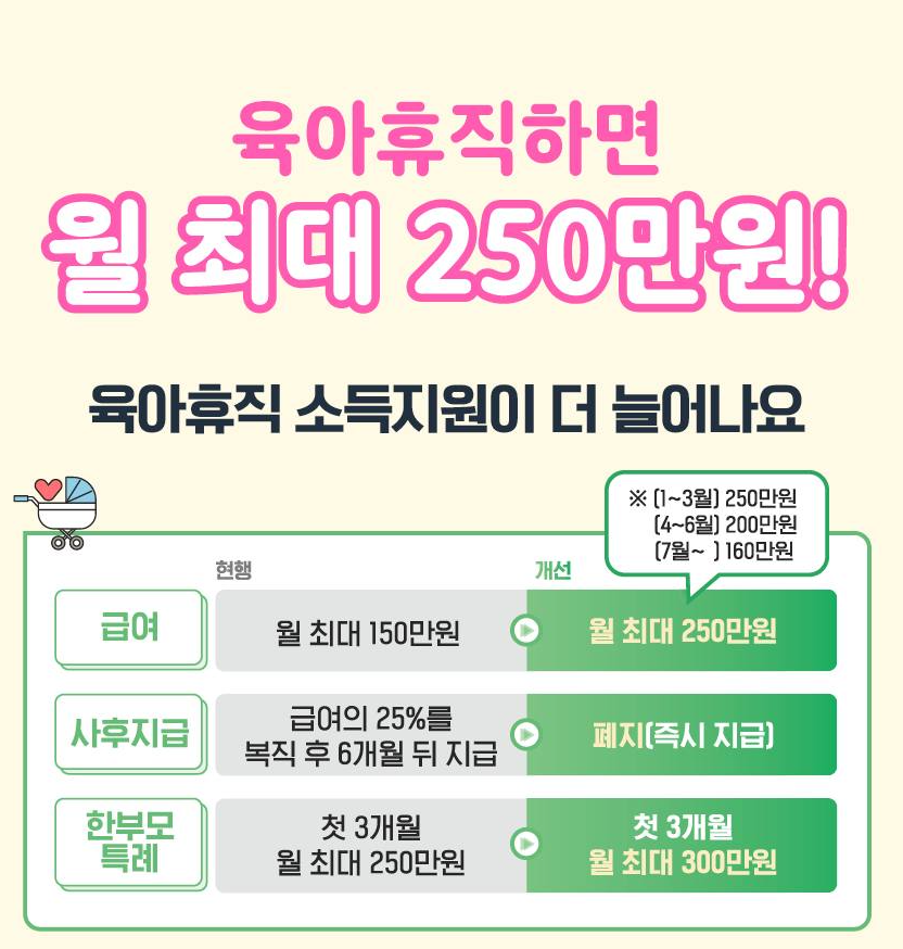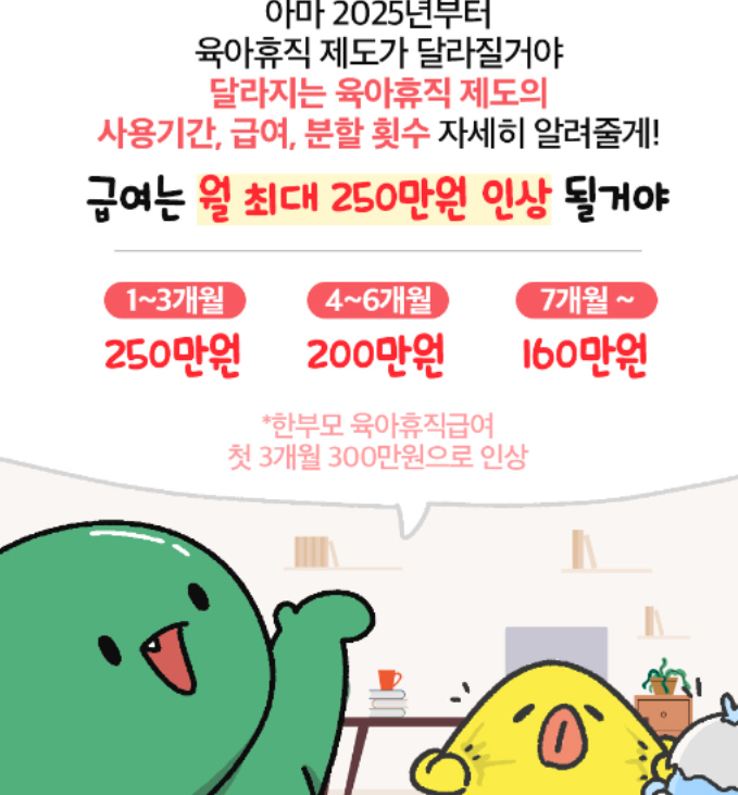 예를 들어, 2024년 11월부터 육아휴직을 사용했다면 2024년 11~12월 급여는 기존 기준(최대 150만 원)이 적용되고, 2025년 1월부터 인상된 급여(최대 250만 원)를 받을 수 있습니다.