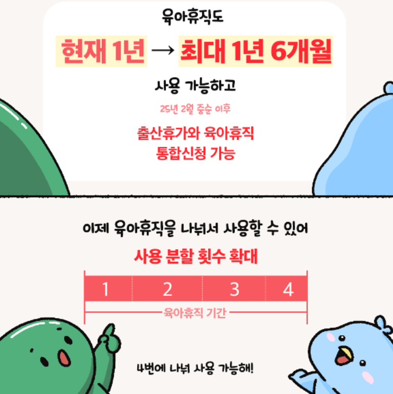 기존 1년이었던 육아휴직 기간이 2025년 2월 23일부터 최대 1년 6개월로 연장됩니다. 맞벌이 부부의 경우 부모가 각각 사용할 수 있어 최대 3년까지 육아휴직이 가능합니다.