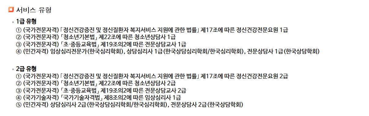 - 상담 서비스: 1회 50분 이상, 총 8회의 1:1 대면 심리상담을 제공하는 바우처 지원