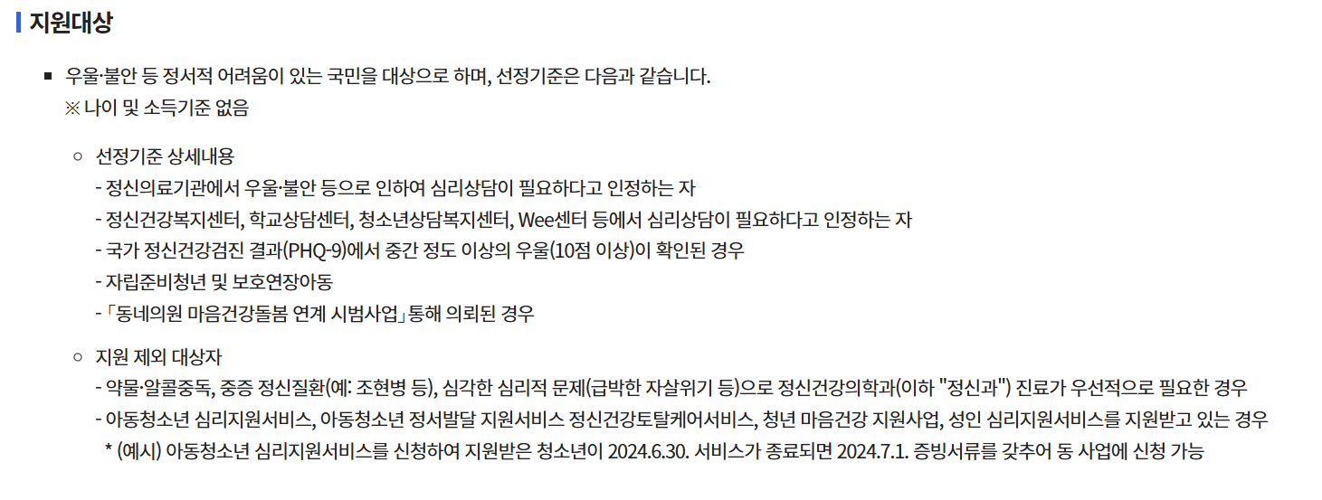전국민 마음투자 지원사업 대상자는 우울·불안 등 정서적 어려움이 있는 국민 중 아래 기준에 해당하는 자로, 나이 및 소득 기준은 없습니다.
