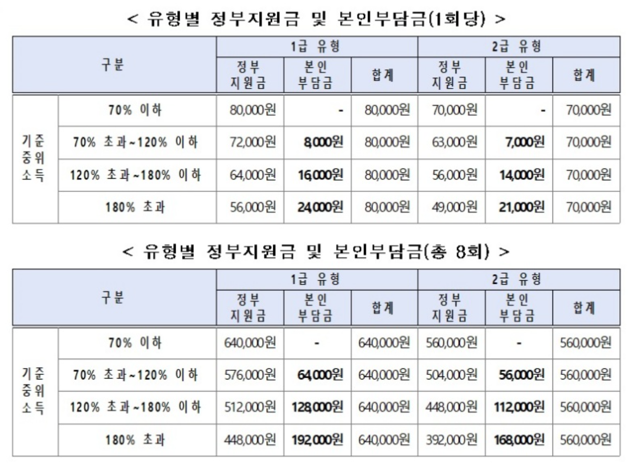 전국민 마음투자 지원사업 지원금액은 제공 인력의 전문성과 역량에 따라 1급과 2급 유형으로 구분되며 서비스 1회 기준 1급 유형은 8만원, 2급 유형은 7만원 지원됩니다. 본인 부담금은 소득 수준에 따라 30%까지 차등 부과 됩니다. 단 자립준비청년 및 보호연장아동은 본인부담금을 면제합니다.