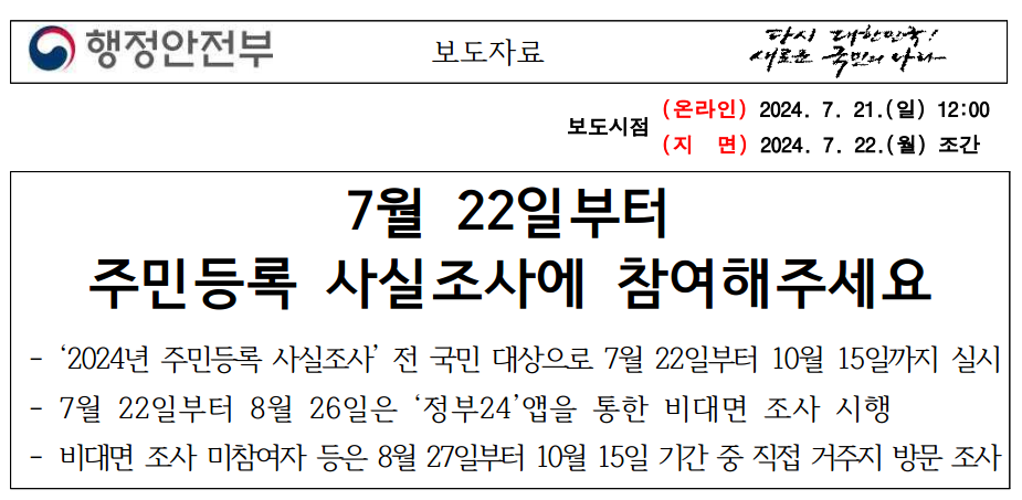 주민등록 사실조사는 행정안전부 주관으로 2024년 11월 18일까지 전국적으로 진행됩니다. 방문조사에 앞서 정부24 주민등록 사실조사가 비대면으로 정부24 앱에서 사실조사를 우선 실시합니다.