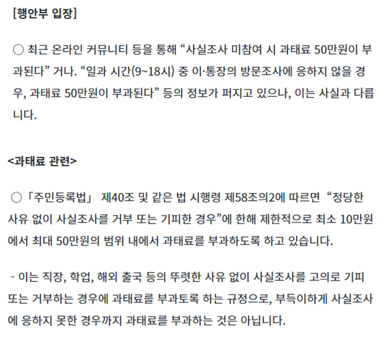 - 주민등록법 제40조 및 시행령 제58조의 2에 따르면 정당한 사유 없이 사실조사를 거부하거나 기피한 경우 제한적으로 과태료가 부과됩니다.